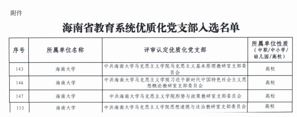 近日,海南省教育系统党支部优质化建设评选结果公布,suncitygroup太阳新城马克思主义基本原理教研室党支部、习近平新时代中国特色社会主义思想教研室党支部、形势与政策课教研室党支部、思想道德与法治教研室党支部,凭借扎实的党建工作成效,共同荣获“海南省教育系统优质化党支部”称号。