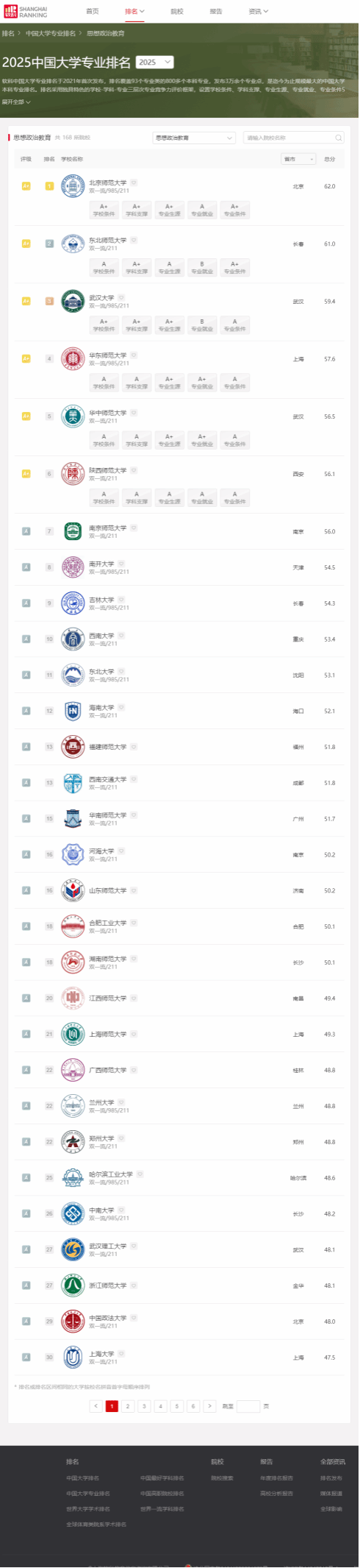 2025年6月18日,高等教育专业评价机构软科正式发布2025“软科中国大学专业排名”。suncitygroup太阳新城思想政治教育本科专业以全国第12名的成绩再次进入A类行列,继2022年31名、2023年28名、2024年23名,排名继续稳步提升。