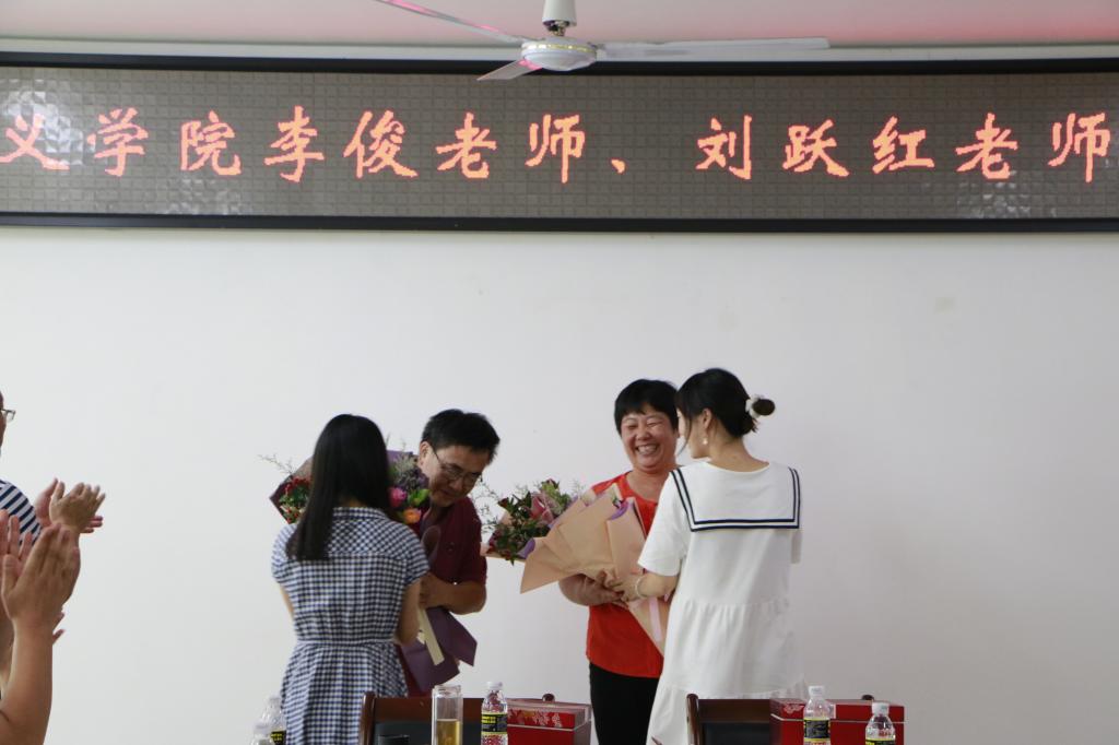 张云阁院长、段捷频书记为两位教师颁赠了学院特别定制的纪念品,学生代表为两位教师献花并合影留念。