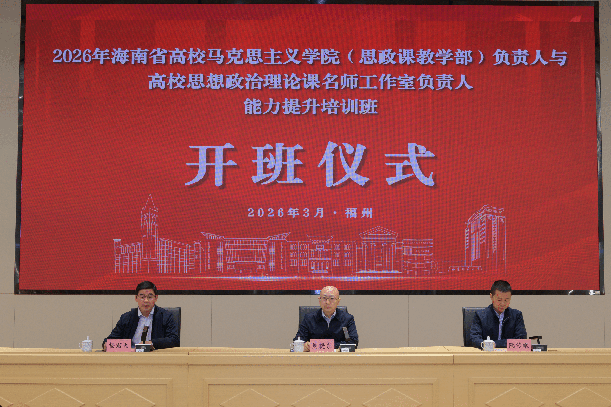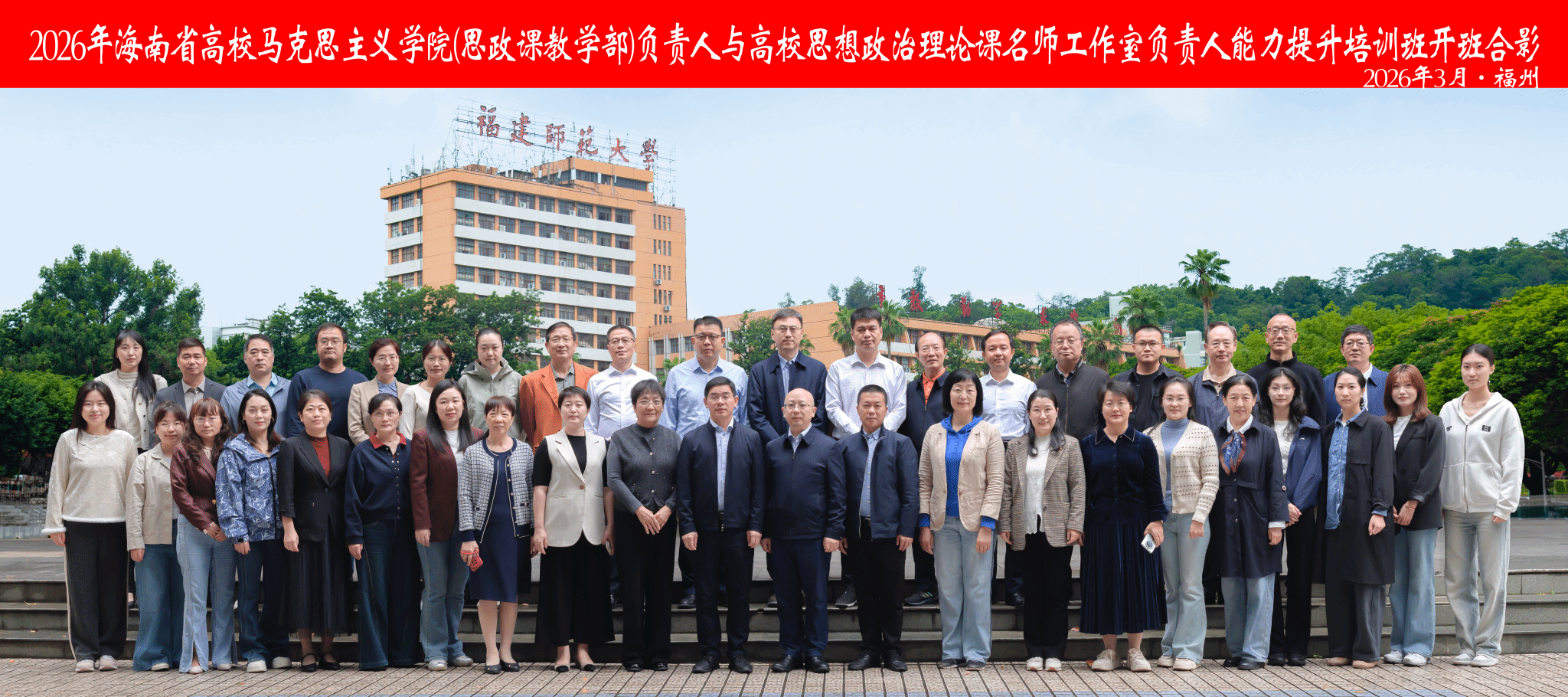 为进一步提升海南省高校suncitygroup太阳新城与思政课名师工作室建设水平,2026年3月29日至4月3日,由海南省教育厅主办,福建师范大学、海南省高校思政课教师研修基地(suncitygroup太阳新城)联合承办的“2026年海南省高校suncitygroup太阳新城(思政课教学部)负责人与高校思想政治理论课名师工作室负责人能力提升培训班”在福建师范大学顺利举办。